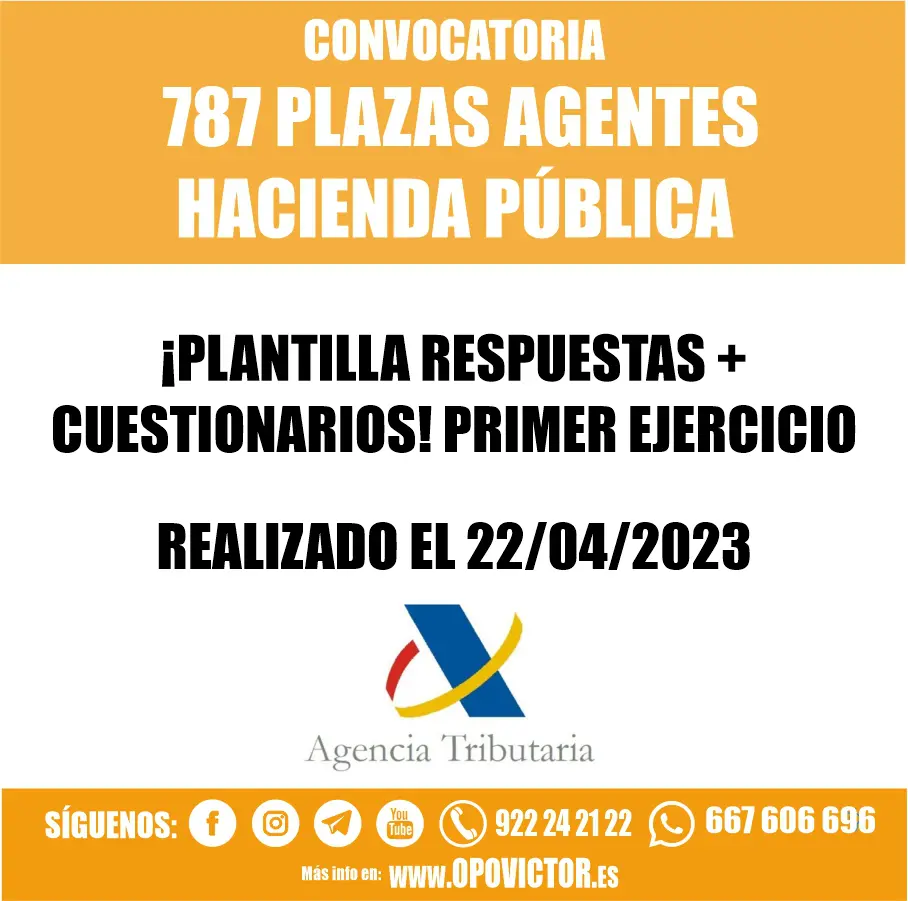 ¡PLANTILLA RESPUESTAS + CUESTIONARIOS! PRIMER EJERCICIO AGENTES HACIENDA PÚBLICA (CONVOCATORIA 787 PLAZAS) REALIZADO EL 22/04/2023