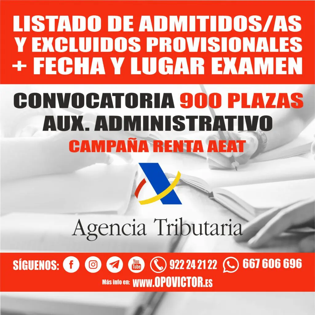¡LISTADO DE ADMITIDOS/AS Y EXCLUIDOS PROVISIONALES + FECHA Y LUGAR EXAMEN! CONVOCATORIA 900 PLAZAS AUXILIAR ADMINISTRATIVO CAMPAÑA RENTA AEAT
