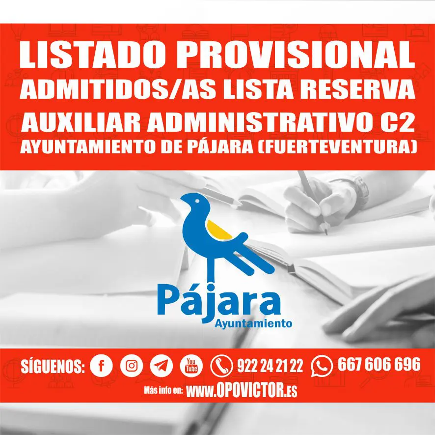 LISTADO PROVISIONAL DE ADMITIDOS/AS: LISTA DE RESERVA AUXILIAR ADMINISTRATIVO C2,AYUNTAMIENTO DE PÁJARA (FUERTEVENTURA)